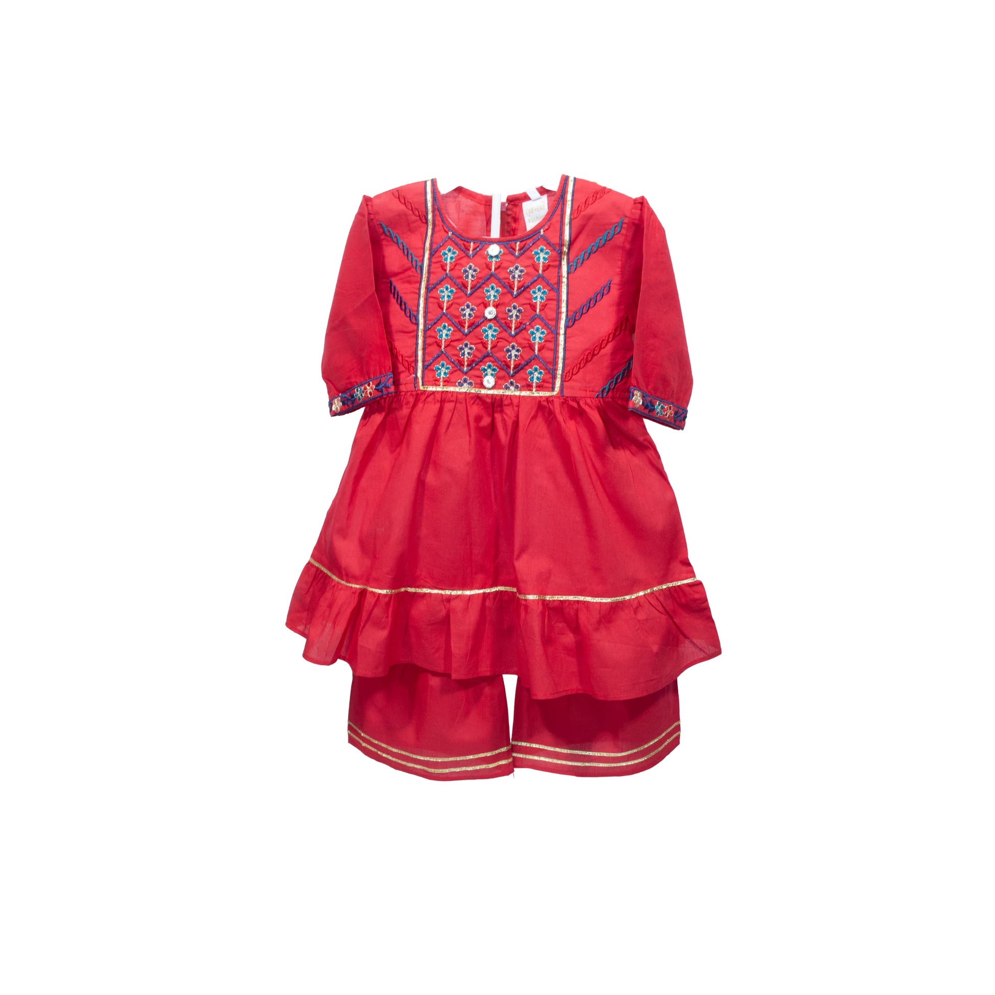 Frock-style top with a square neckline and multi-color embroidery on the front, paired with matching trousers. The top features a ruffled hem with golden accents, and the trousers have a flared, bell-bottom style with golden accents near the hem.