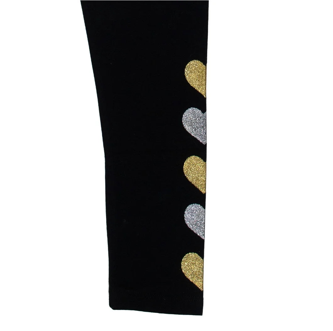 These stylish black leggings feature charming gold and silver heart details along the lower leg, adding a touch of sparkle and fun to any outfit. Made from a comfortable and flexible fabric, they are perfect for everyday wear, play, or special occasions, offering both comfort and a fashionable look.
